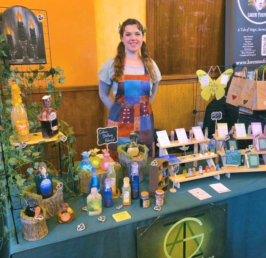 In my witchy shop, you’ll find D&D-inspired potions, spell jars, and Fae-themed accessories. All handmade by yours truely.