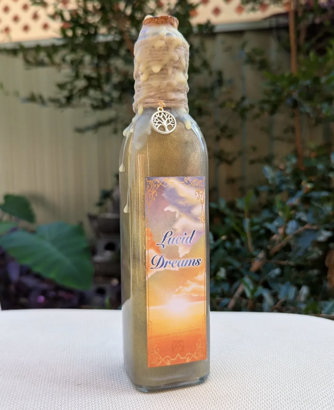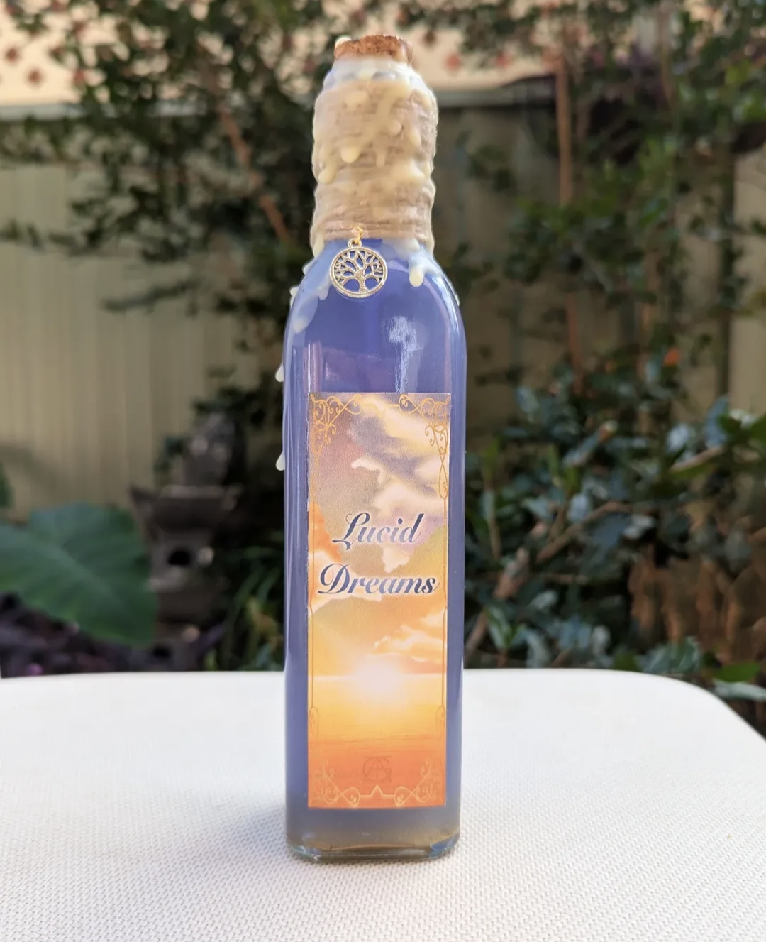 This bottle contains a lilac liquid that swirls with gold glitter when shaken and settles back down to lilac after several minutes. It is decorated with twine, a tree of life charm, yellow wax, and a custom designed label by yours Truely ✨